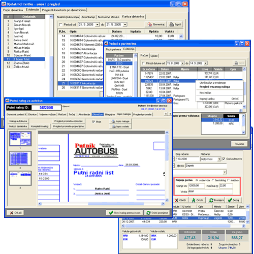 Napredne funkcije ugrađene u program omogućavaju vođenje blagajničke evidencije i praćenje uplata i isplata djelatnicima. Ugrađene su funkcije obračuna međunarodnih dnevnica - automatski se obračunavaju dnevnice prema prolascima kroz države. Alternativno je moguće obračunavati dnevnice prema odredišnoj državi, pa prema tome tvrtke mogu koristiti postupak koji su dosad koristile.DOKUMENTACIJA - upute za korištenje - preuzmi (1.7 MB) Radi se o trećem proizvodu iz serije PUTNIK. Osim programa za izradu i evidenciju putnih nalog za djelatnike PUTNIK (detaljnije) i sustava evidencije radnih i putnih naloga za autoprijevoznike PutnikTRANSPORTI (detaljnije), sada je serija upotpunjena i rješenjem za tvrtke koje se bave autobusima i autobusnim prijevozom. Naravno, podržane su sve vrste autobusnog prijevoza - javni linijski prijevoz, javni slobodni prijevoz, te prijevoz za vlastite potrebe. Za svaki nalog se vodi detaljna evidencija pređenih dionica, evidencija plaćenih računa, isplaćena akontacija, pregled prometa putnika i prtljage, evidencija prodanih karata itd. Autoprijevoznicima smo namijenili i vrlo pristupačno, jednostavno a funkcionalno rješenje za vođenje evidencije potvrda o aktivnostima vozača (AETR potvrde) - te funkcionalnosti su ugrađene (i proširene evidencijom vožnje povezanom s putnim radnim listovima) u sustav AUTOBUSI! Budući da mnogim tvrtkama već i samo programsko rješenje može pomoći, ponudili smo ga kao neovisni program - detaljnije. Novi proizvod za vozače - IB.ERS - evidencija radnih sati mobilnih radnika i izrada potvrda o aktivnosima.